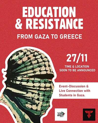 Στο πλαίσιο αυτής της συζήτησης, σας καλούμε στην εκδήλωση «Παιδεία & Αντίσταση: Από τη Γάζα μέχρι την Ελλάδα», η οποία θα πραγματοποιηθεί την Πέμπτη 27 Νοέμβρη, στις 17:30, στην Ιατρική Σχολή Αθηνών, στο αμφιθέατρο ΝΑΒΟ. Εκεί θα συνδεθούμε απευθείας με τη Γάζα, με συμμετοχή της φοιτητικής πρωτοβουλίας WAQD, του Καθηγητή και Κοσμήτορα της Ιατρικής Σχολής του Πανεπιστημίου Al Azhar Mohamed Zughbur και του καθηγητή Marwan Salim Al Agha από το ίδιο Πανεπιστήμιο.